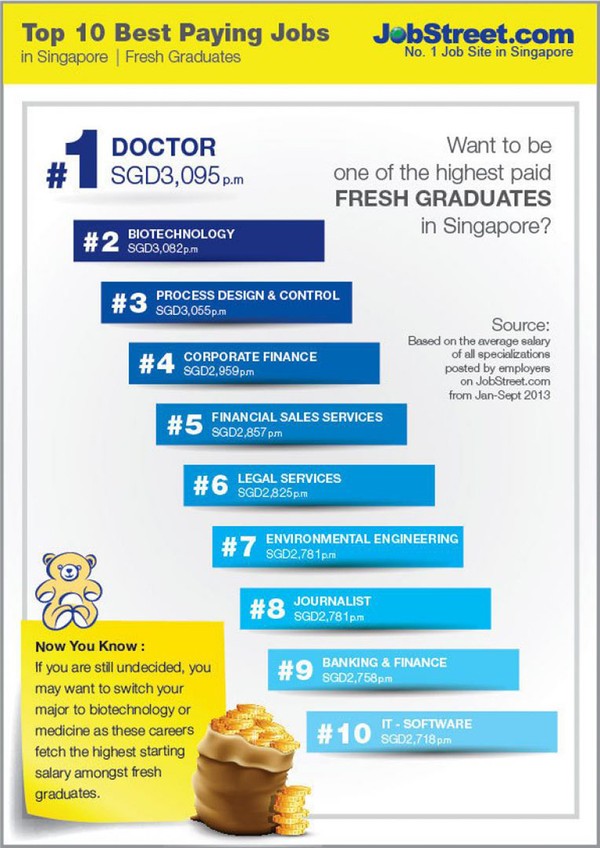 Theo thống kê, mức lương bình quân dành cho các tân cử nhân vừa ra trường vào khoảng 2,853 SGD cho sinh viên có xếp loại bằng cấp là Honors-Second Lower. Với xếp loại bằng cấp Honors-Second Upper, mức lương rơi vào khoảng 2,939 SGD. Trong khi đó, những sinh viên có thành tích học tập dạng trung thì có mức lương rơi vào khoảng 2,741 SGD (Theo Singapore Business Review, 2014).